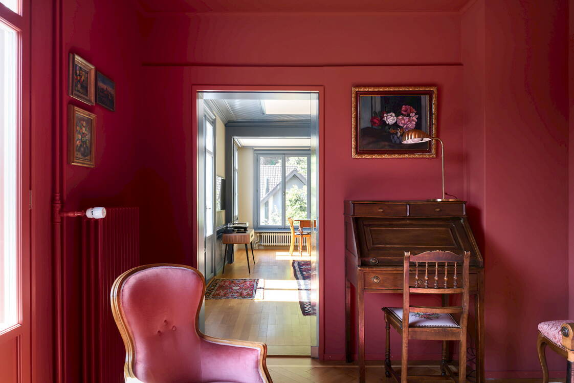 Die «Villa Taeuber» besticht durch ihre markante, purpurrote Holzfassade. Doch auch ihr Inneres hat es in sich: Nun wurden die Räume durch einen sanften Umbau aufgefrischt und gekonnt unserer Zeit angepasst. So entstanden in enger Zusammenarbeit mit der Bauherrschaft wunderschöne, charakterstarke Räume, die durch ihre Grosszügigkeit und ein attraktives Farbkonzept bestechen.