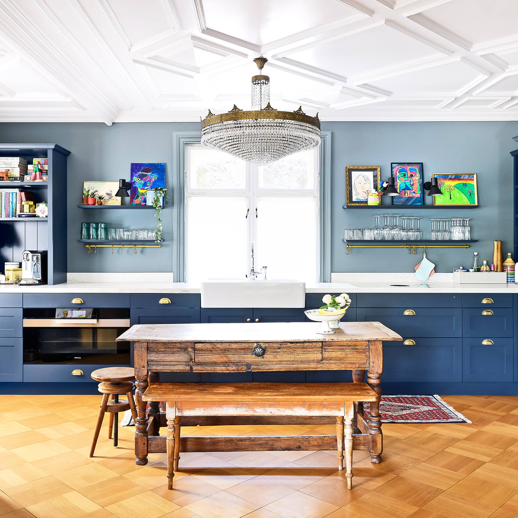Eine modern umgebaute Küche mit Altbaucharme, Oberflächen und Boden in Holz gearbeitet, Stuckaturen und Kronleuchter an der Decke.